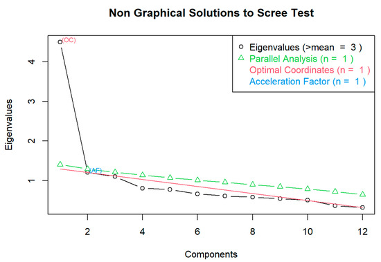 - Raiche, G.; Magis, D.; Raiche, M.G. Package NFactors, version 2.4.1.1; Repository CRAN. 2020. Available online: https://cran.r-project.org/web/packages/nFactors/index.html (accessed on 23 December 2024).