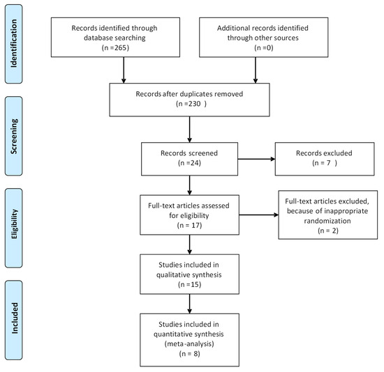 The initial survey using keywords in databases indicated 265 studies. After reading the title and abstract, 24 articles were selected that met the inclusion criteria, as shown in Figure 1. Subsequently, following the analysis of the two trained reviewers, 15 articles were included in the present study, in fact for the systematic review. Nine studies were excluded: 2 studies due to inadequate randomization, 1 study only compared groups in different laser protocols, 4 studies in which the control group received only a placebo without medication, 1 study that compared laser with ozone therapy, and 1 study that used a pulsed light device.