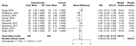 The eight studies were pooled for meta-analysis. The forest plot (Figure 3) describes the meta-analysis using a weighted difference of the means between the two comparison groups, that is, the laser group and the control group with drugs to control pain, according to the values of the VAS pain scale. Substantial heterogeneity was observed between the studies (I2 = 62%; p < 0.01), and for this reason the random effects model was chosen. The results of the overall analysis evidence a significant reduction in pain on the second day after surgery for the experimental group compared to the control (MD, −1.15; 95% CI, −1.73, −0.57).