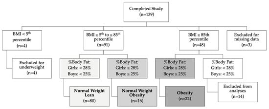 Participants were classified by gender, BMI percentiles [27], and BF percentage as NWL, NWO, or OB (Figure 1). Participants were classified as NWL if their BMI was between the 5th and 85th percentile; BF percentage was ≤24.9% for boys and ≤27.9% for girls, while those classified as NWO fell within the same BMI percentiles but had BF percentages of ≥25% for boys and ≥28% for girls [16]. Participants were classified as OB if BMI was above the 85th percentile and BF was ≥25% for boys and ≥28% for girls [16]. Participants who did not fit any of these three classifications (n = 16) were excluded from analyses by weight classification.