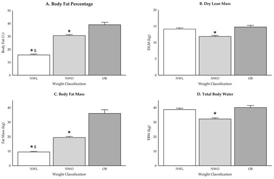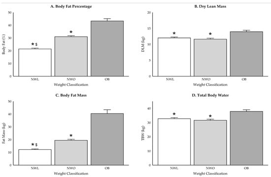 (A–D) Differences in body composition for the whole sample. * indicates significant difference from OB (p < 0.05) and $ indicates significant difference from NWO (p < 0.05).
