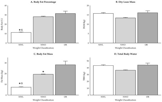 Participant group demographics are reported in Table 1, and differences in body composition variables are displayed in Figure 2, Figure 3 and Figure 4. While there were no differences in weight between those classified as NWO and NWL (p = 0.37), NWO adolescents had higher BMI (p = 0.006), BF percentage (p < 0.001), and fat mass (p < 0.001) values compared to NWL adolescents. Further, those classified as NWO had significantly lower DLM (p = 0.02) and TBW (p = 0.02) values than those classified as OB, but there were no differences between NWL and OB adolescents (DLM: p = 0.08; TBW: p = 0.09) or NWL and NWO (DLM: p = 0.4; TBW: p = 0.4).