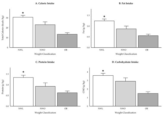 Relative caloric (A) and macronutrient (B) fat, (C) protein, (D) CHO intake by weight classification while accounting for sex. * denotes significant difference from OB (p < 0.001). Estimates and standard errors for NWL versus OB: Kcal·kg−1 = +17.1 (3.5), p < 0.001; Protein = +0.70 g·kg−1 (0.18) g·kg−1, p < 0.001; Fat = +0.73 (0.16) g·kg−1, p < 0.001; CHO = +2.0 (0.46) g·kg−1, p < 0.001.
