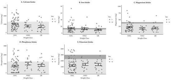 For vitamins, NWL adolescents consumed significantly more riboflavin (+146.1 mg [58.8] mg, p = 0.04) and niacin (+198.7 [80.3] mg, p = 0.04) than NWO adolescents and significantly more niacin (+164.1 [68.3] mg, p = 0.047) and vitamin K (+63.9 [25.9] mcg, p = 0.04) than OB adolescents. For minerals, NWL adolescents consumed significantly more magnesium than the NWO group (+1052 [402] mg, p = 0.03) and the OB group (+854 [342 mg], p = 0.04), and significantly more iron than the NWO group (+851 [338] mg, p = 0.04). Further, girls consumed less calcium (−402 [150] mg, p = 0.008) and phosphorus (−368 [183], p = 0.047) than boys, but there were no sex differences for any other vitamin or mineral. Despite a few significant differences, mineral consumption was assessed relative the RDA to assess diet quality. Results indicated over half (total = 57% [girls = 54%; boys = 60%]) of participants met the RDA for zinc, but this was not the case for calcium, iron, magnesium, phosphorus, or potassium (Figure 6A–E). Further, 45% of participants (girls = 43%; boys = 47%) consumed excess sodium, with 43% of NWL adolescents, 38% of NWO adolescents, and 59% of OB adolescents consuming above the recommended amounts (>2300 mg).