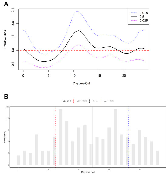 Figure 3A shows the relative risk for occurrences attended by SAMU over a 24-h period. The lowest-risk period was near 4:00 h, with a risk of 0.58. This finding indicates a 42% reduction in the risk of the response time exceeding 5 min, as represented by the median line and confidence interval below the threshold of 1.0. By contrast, at about 11:00 h, the risk achieved its maximum value (1.73). In other words, there was a 73% increase in the risk of the response time exceeding 5 min. Figure 3B shows the frequencies of daily occurrences, with peaks at 6:00 and 16:00 h and mean values near 12:00 h. The hour with the lowest occurrence was 00:00 h.
