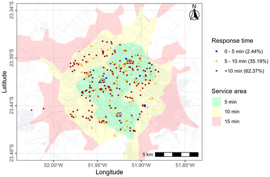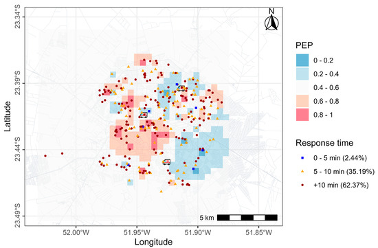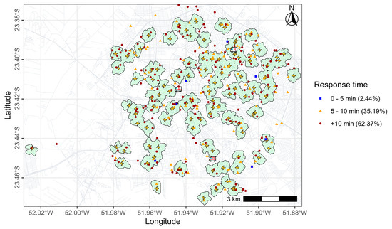 Figure 6 depicts a map of Maringá, divided into 500 m2 cells. Variations in response times seemed to be random throughout the municipality. Nevertheless, there was a higher frequency in regions with mean times between 8 min 20 s and 11 min 40 s, especially from the center to the northeast. Only three cells had a mean response time of less than 5 min.