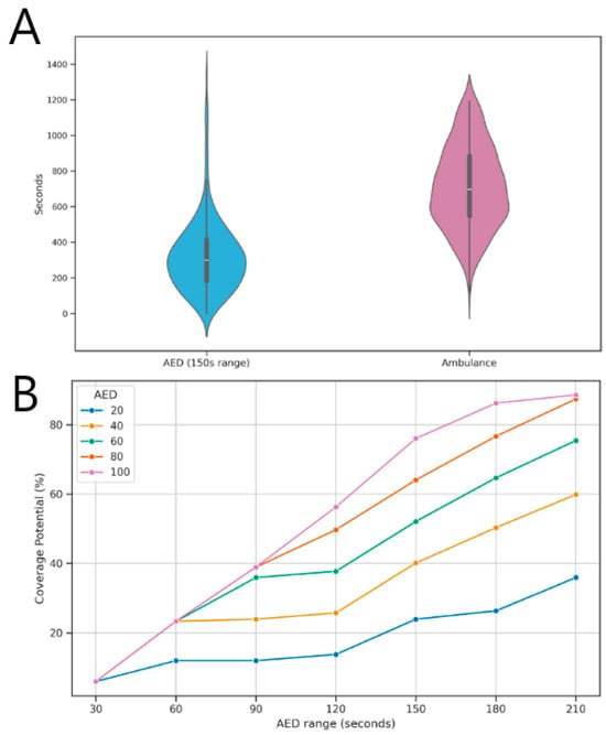 Comparison of coverage times: (A) Difference between response times with ambulance and with AED implementation; (B) Variation in coverage times with different AED availability.