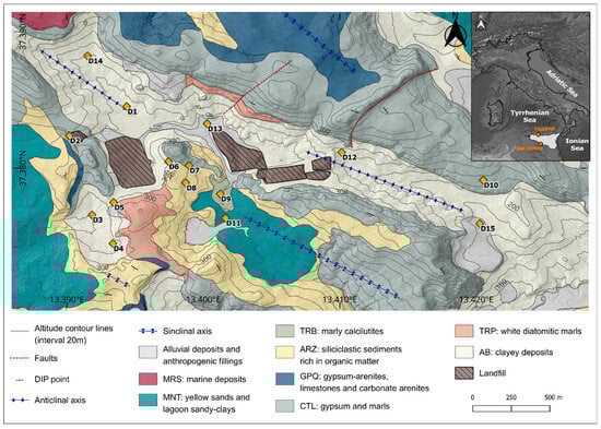 The morphological setting is given by an almost closed depressed and elongated area, which corresponds to an eroded anticline axis sector stretching NW-SE. From a geological perspective, the area is characterized by high lithological heterogeneity (Figure 1), dominated by the outcropping of the evaporitic succession “Gessoso-Solfifera” members, dating to the Messinian [37]. The evaporitic deposits include: gypsum (GTL), in its two formations “Gessi di Cattolica” (CTL) and “Gessi di Pasquasia” (GPQ), clays, marls, and carbonate. The stratigraphic succession of the study area is characterized by a base of clay deposits, the “Argille di Base” Formation (AB), which includes grey-blue clays of the “Licata” Formation (LCT) and fluvio-deltaic clayey deposits of the “Terravecchia” Formation (TRV), along with diatomaceous laminates from the “Tripoli” Formation (TRP). Above these lies the Messinian succession, which consists of two sedimentary cycles [38] separated by an angular unconformity and overlain by siliciclastic sediments from the “Arenazzolo” Formation (ARZ). Over this succession are the Pliocene marls of the “Trubi” Formation (TRB), while the most recent Pleistocene units include sandy clays and arenites of the “Montallegro” Formation (MNT).Within the morphological depression characterizing the area and along the courses of its two small surface channels, an alluvial deposit is present. This deposit consists primarily of silts, sands, and clays rich in reprecipitated gypsum crystals originating from erosion and runoff processes affecting the internal slopes bordering the area. The thickness of this horizon varies, averaging a few meters at most. The main outcropping lithology in the area can be hydrogeologically characterized as follows: high permeability due to fracturing (“Cattolica” Formation: CTL) or porosity (“Montallegro” Formation: MNT); medium or low permeability due to porosity (“Arenazzolo” Formation: ARZ) or fracturing (“Pasquasia” Formation: GPQ); and very low permeability due to fracturing (AB). In light of the characteristics of the identified hydrogeological complexes and the reconstructed geological structure, the area corresponds to a groundwater body mostly hosted within the basal clay complex, containing modest amounts of groundwater.