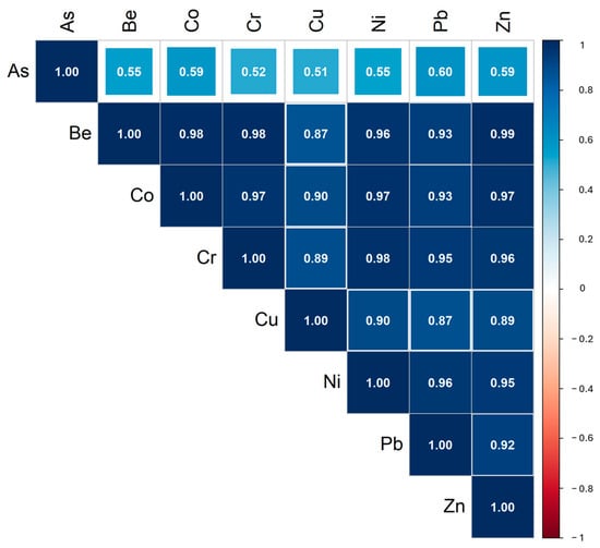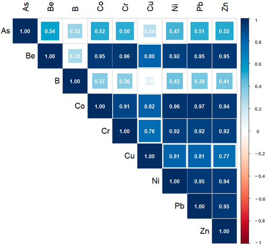 With the exception of As, the matrices show a consistent trend in pairwise correlations, suggesting that these M&Ms could have a common source. This may be influenced by the bedrock composition, which strongly controls the overlying soil, as soil formation primarily involves rock weathering [54].
