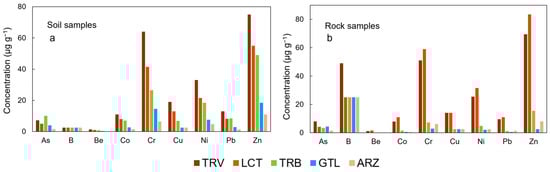 Concentrations below the limit of detection (LOD) of the analytical method used for analysis were expressed as half the LOD [43]. B was consistently below the detection limit for soil samples. The results of the Shapiro–Wilk normality test (p < 0.05) suggest an asymmetric distribution for all elements. For soil samples, the analyzed elements showed median concentrations ranging from 0.77 to 40 μg g−1, with the following order of abundance: Zn > Cr > Ni > Cu > Co > Pb > As > B > Be. In rock samples, the range of median values is higher than for soil samples (1.70 to 74.0 μg g−1), with the following order of abundance: Zn > Cr > Ni > B > Cu > Pb > Co > As > Be. This confirms Zn, Cr, and Ni as the most abundant among the determined elements, with Be being the least abundant.