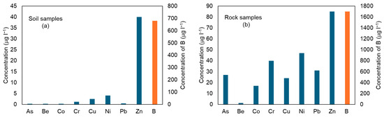 From the leaching test results (Figure 5), it is evident that the highest concentrations of elements in the eluate, for both rock and soil samples, are for B, Zn, and Ni.