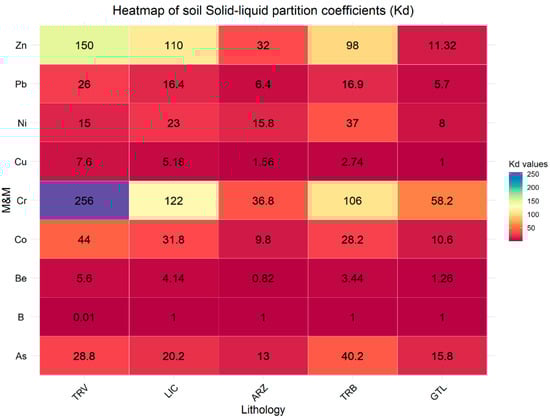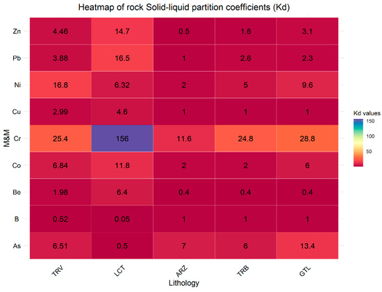 Compared to soil samples, lower Kd values are observed in rock samples. This indicates that soil has a greater capacity to immobilize elements, thereby reducing the risk of groundwater contamination. Generally, the higher Kd values in the soil can be attributed to the greater presence of organic matter and minerals that enhance metal adsorption [55,56]. The lithologies TRV, LCT, and TRB in soil samples show significantly higher Kd values for As, Co, and Zn, indicating a greater potential for retaining these metals. In contrast, in rock samples, the lithologies TRV, LCT, and TRB present lower Kd values for the same elements, suggesting a less solid affinity of these elements. This difference reflects the distinct behavior between soil and rock in absorption and holding M&Ms. Moreover, in soil and rock samples, clay-rich lithologies LCT and TRV show a greater ability to retain and immobilize metals than other lithologies; this reflects the mineralogical characteristics of clay-rich rocks that allow greater interaction with metallic elements, thus reducing their mobility [54,57,58,59,60,61,62].