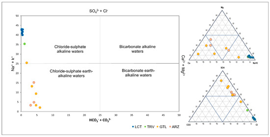 This diversification reflects the close relationship between the chemical composition of groundwater and water–rock interaction processes. Therefore, two main groups of water samples can be identified: the first consists of waters that have flowed through clay-rich rocks, such as those belonging to the LCT and TRV formations; the second is associated with lithologies typical of the gypsum-sulfate series, such as the ARZ and GTL formations. This correlation highlights the rock matrix’s fundamental role in determining the waters’ composition.
