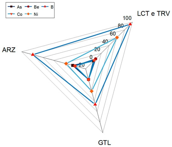 A similar consideration can be made for Ni, which is more frequently found in clayey lithologies (LTC and TRV), followed by GTL and ARZ. Exceedances of Be and Co are recorded exclusively in clayey lithologies (LTC and TRV), while As is excessive only in ARZ. By observing the distribution coefficients of these elements in relation to lithology, it is noted that for both B and Be, the value of Kd varies from 0.01 (TRV) to 1 (GTL) and from 1.98 (TRV) to 5.6 (TRV), respectively; this indicates a strong affinity with the liquid phase, thus justifying the presence of these elements in groundwater. Regarding As, a decrease in the partition coefficient value is observed, from 13 for soils associated with the ARZ formation to 6 for rocks of the same lithology. This difference is linked to various factors characterizing soils, such as the presence of iron/manganese oxides, organic matter, humic acids, and clay minerals, which tend to retain metals and metalloids (M&Ms) [22,81,82,83,84]. The partition coefficient values suggest a strong affinity with the liquid phase in both cases. The same observations apply to Co, which shows decreasing values from soils to rocks (from 31.8 to 11.75 for LCT and from 44 to 6.84 for TRV), suggesting a strong affinity with the liquid phase.