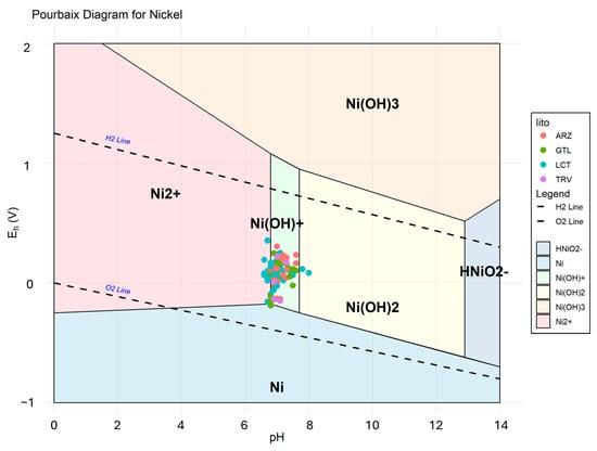 The Kd values calculated for Ni range from 8.27 to 1.89 in gypsum, from 23.29 to 6.32 in LCT, and around 16 in both soils and rocks in TRV. Depending on the lithology involved, these values indicate a varying affinity with the liquid phase. A partition coefficient of 16 for clay-rich lithologies suggests that Ni has a moderate affinity for the solid. Therefore, the presence in groundwater is influenced by the physicochemical conditions (pH-Eh) characterizing the sampled waters, which determine the presence of Ni in solution predominantly as Ni2+ ion and/or Ni(OH)+ (Figure 10).