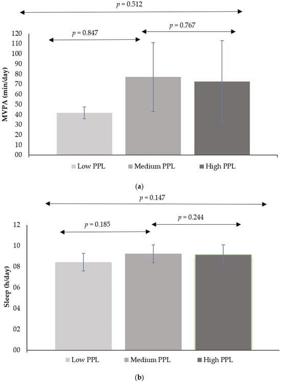 The results of the marginal means for time spent in MVPA and sleep time, broken down by PPL status, are presented in Figure 1. No statistically significant differences were observed between PPL groups in terms of MVPA time (p = 0.512). In this regard, the poc-hoc analyses showed no significance between the groups: Low-medium PPL (p = 0.847) 95% CI [−101.51, 39.84] and medium-high (p = 0.767) 95% CI [−41.4, 112.25]. Regarding sleep time, no differences were also observed between the PPL groups (p = 0.147). Consequently, the post-hoc analyses showed no significance between the groups: Low-medium PPL (p = 0.185) 95% CI [−1.65, 0.21] and medium-high (p = 0.244) 95% CI [−0.32, 1.92]. Similarly, no significant differences were found in total screen time across the PPL categories (p = 0.277).