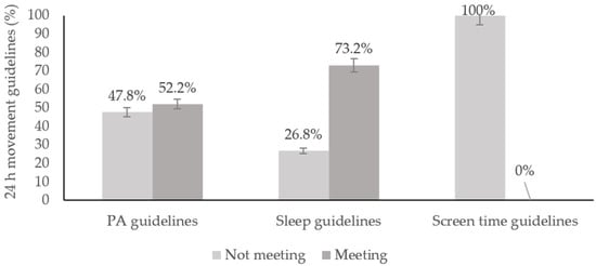 Moreover, previous studies that investigated movement behaviors using self-report tools, such as the review by Tapia-Serrano et al. [43], have found that only 38.0% of their 1276 adolescent subjects met the PA guidelines, 82.6% met the sleep guidelines, and 15.4% met the screen time guidelines. In Spain, 34.9% of adolescents spend more than 2 h and 29.1% spend more than 3 h in front of screens. The increase in daily leisure screen time was found to be associated with shorter sleep duration [44]. Similarly, a study on Australian adolescents [41] showed that only 2.4% of 3.096 participants met all recommendations, with an average of 28.1 min of MVPA, 3.2 h of screen time, and 9.5 h of sleep per night. Additionally, in the study by Brady et al. [45], only 13% of the study population, with a mean MVPA of 33 min/day, met the guidelines for MVPA measured with an accelerometer. Hansen et al. [46] described prevalence estimates of PA, screen time, and sleep among German youths aged 9 to 18 years (n = 15,786), finding that only 9.7% of respondents met all three combined guidelines, and approximately 25% did not meet any of the guidelines. Half of the participants (50%) met the sleep guidelines, and approximately one-third met only the screen time (35%) and PA (37%) guidelines. The similarities and differences between studies can be attributed to cultural and socioeconomic factors, as well as the availability of electronic devices [47]. This highlights a global problem in which adolescents mainly do not adhere to screen time guidelines, although a good portion meets sleep guidelines and, to a lesser extent, PA guidelines. Therefore, future studies should investigate the causal relation between PPL and adherence to movement guidelines.