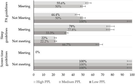 Percentage of adolescents in each category meeting movement recommendations (none, meeting 1 guideline, meeting 2 guidelines or meeting 3 guidelines) within each PPL status.