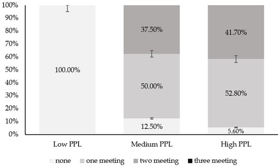 Figure 4 shows the percentage of adolescents in each adherence category to the movement guidelines within each PPL status. The results indicate a significant relationship (χ2 = 10.876, df = 4, p = 0.028, V = −0.01) between the adherence categories to the 24-hour movement guidelines (meets/does not meet) and the PPL categories (low, medium, and high). In the case of medium PPL, 50.0% met at least one recommendation, compared with 52.8% in the high PPL category. Additionally, 37.5% of participants in the medium PPL category met two recommendations, versus 41.7% of participants in the high PPL category. It is noteworthy that no participants met all three recommendations, regardless of their PPL level. Furthermore, 100% of participants with low PPL did not meet any recommendation.