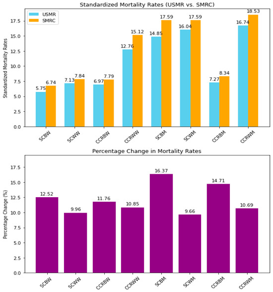 Among men, Black individuals showed the highest percentage increases. Black men experienced a 16.37% rise in corrected SC mortality rates (from 12.76 to 14.85 deaths per 100,000) and a 14.71% increase for colorectal cancer (from 7.27 to 8.34 deaths per 100,000) (Figure 1, Table S1).