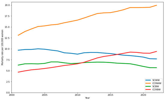 Adjusting for under-reporting revealed a greater increase in standardized mortality rates for SC among Black women. Their rates rose by 12.52% (from 5.75 to 6.47 deaths per 100,000), compared to a 9.96% rise among White women (from 7.13 to 7.84 deaths per 100,000) (Figure 1, Table S1). For CCR, Black women showed an 11.76% increase (from 6.97 to 7.79 deaths per 100,000), whereas White women had a 10.85% rise (from 13.64 to 15.12 deaths per 100,000) (Figure 1, Table S1).