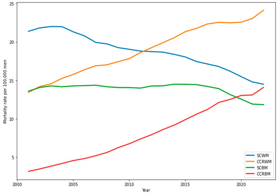 Among White men, CCR mortality rates surpassed SC rates around 2010, reversing earlier trends. For Black men, SC mortality remained higher than CCR mortality until 2018 (Figure 2). While SC mortality among Black men remained stable for most of the study, it decreased toward the end. In contrast, CCR mortality rose sharply, surpassing SC rates by the study’s conclusion. White men showed consistent reductions in SC mortality, while Black men experienced increases until 2016–2019. CCR mortality rates increased steadily for both groups throughout the study (Table 2).