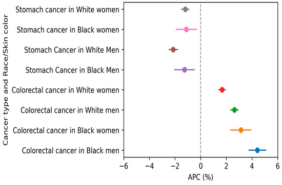 Annual Percent Change (APC) and its lower and upper limits for stomach and colorectal cancer in men by race/skin color in Brazil (2000 to 2023), estimated using Prais–Winsten regression.