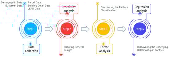 As demonstrated in Figure 1, the research methodology of this study is divided into four main stages. Stage one, data collection, including collecting and merging different data to create a unified dataset for the state of Indiana on a census tract scale, including environmental, demographic, health, building attributes, and energy information. Afterward, the descriptive analysis was implemented in stage two to provide a general insight into the data characteristics and build the initial hypotheses. Next, a factor analysis was employed to determine the variable classifications and describe the health issues categorized with other parameters. Lastly, the ordinary least square (OLS) regression and several machine learning methods were deployed to discover the underlying intensity of the influential factor and provide the most suitable model for health issues prediction in each census tract. The details of each stage are explained in the following Sections.