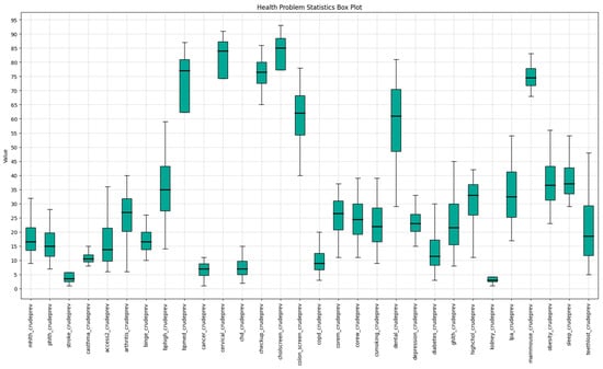 While most of the previous studies have mainly focused on a one-dimensional perspective toward health problems, including investigating one factor or one group’s impact on health problems, only a few researchers have worked on extracting the influential factors. Che and Shi (2020) worked on assessing the urban health level using several environmental and social factors. This study focused on GPD and consumption level as socio-economic factors, solid waste, wastewater, soot emission, and forestry as environmental ones, as well as several life factors, including population, access to libraries, state insurance, and traffic accidents []. However, this study used factor analysis to find the similarity and rank the cities’ health status based on these factors.