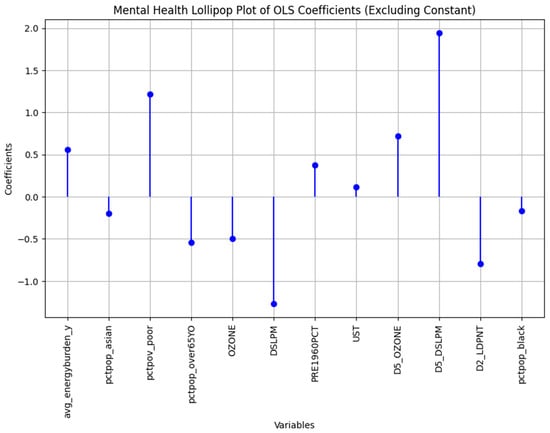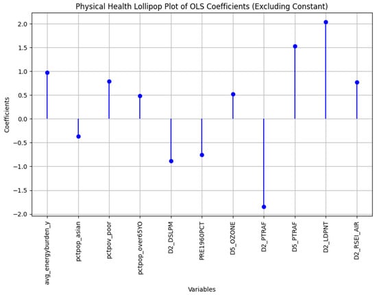 The F-statistics of the model were 441 and 319 for the mental health regression model and physical health regression model, respectively, determining that the overall models’ results are statistically significant. A threshold of 0.05 was chosen to select the variables in the models. As demonstrated in Table 5, the mental health model ended up with Average Energy Burden and Poverty and the socioeconomic factors, the percentage of Asian, Black, and over 65 years population as the demographic factors, and seven environmental variables (see Table 5).