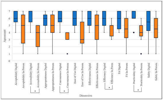 Box and whisker plots indicating client participants’ (n = 11) median AQMH survey scores, first and third quartiles, and minimum and maximum scores. * = Significant difference (p < 0.05) between median scores for digital delivery vs in-person therapy based on paired-sample Wilcoxon signed-rank test, corrected for multiple comparisons. Blue refers to digital delivery; orange refers to in-person delivery. ● Indicates outlier.