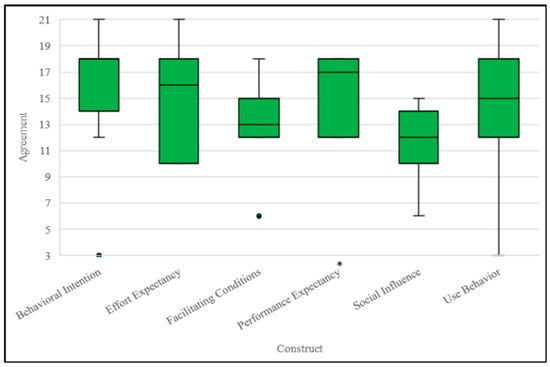 All client participants agreed that digitally delivered trauma therapy services were a viable alternative to in-person delivery. Client participants indicated they somewhat agreed, agreed, or strongly agreed with the Effort Expectancy (score: 16/21), Performance Expectancy (score: 17/21), Behavioral Intention (score: 18/21), and Use Behavior (score: 15/21) constructs. Multiple comparison analysis revealed that only Performance Expectancy (p = 0.011) scores were significantly different compared to the expected median scores. Client participants also indicated that they neither agreed nor disagreed with the Social Influence (score: 12/21) and Facilitating Conditions (score: 13/21) constructs (Figure 2, Table 2).