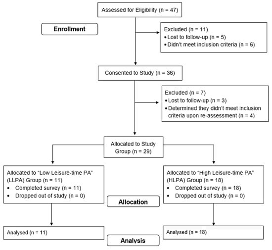 After screening to ensure that the individuals met the study’s inclusion criteria, 29 participants completed the survey (LLPA, n = 11; HLPA, n = 18). The majority of the participants were female (86.21%) and educated (65.52% held a bachelor’s degree or more); 44.83% identified themselves as Black, and 41.37% identified themselves as Latino. Independent-samples t-tests did not reveal significant differences in demographic variables (p > 0.05). Participants in the HLPA group engaged in more leisure-time PA (LLPA = 44.55 ± 48.40 min/week, HLPA = 448.89 ± 227.43 min/week; F(1, 27) = 33.39, p = 0.001, d = 2.21) at the time of enrollment. Practical effect size differences were observed between groups for body mass (d = −0.53) and body mass index (BMI, d = −0.42). The remaining demographic data can be found in Table 1. A full description of the participant flow through screening and informed consent is shown in Figure 1.