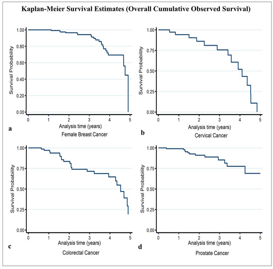 Overall cumulative observed survival by cancer type: (a) female breast, (b) cervical, (c) colorectal, and (d) prostate.