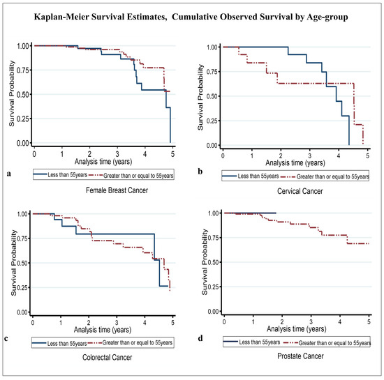 Concerning differences between the probabilities of the survival curves for each variable of interest, our study results suggest that, for each cancer type, while patients aged 55 years or older had a lower cumulative overall observed survival, there was generally no significant difference in the cumulative overall survival between them and those aged less than 55 years, an observation that could be the effect of a probable link between aggressive disease processes and a population composed of 85% of persons of African ancestry [42,43].