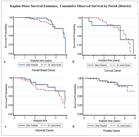 Overall cumulative observed survival by parish (district): (a) female breast, (b) cervical, (c) colorectal, and (d) prostate.