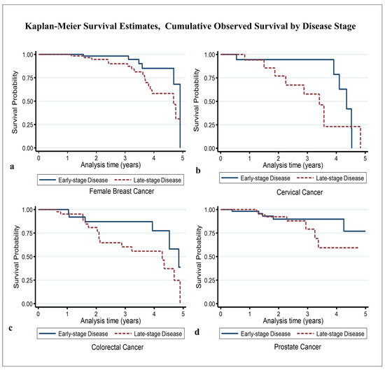 Estimates of the cumulative observed survival for individuals with late-stage disease appear to be lower than that for persons with early-stage disease. Despite this observation, however, univariate Cox regression suggested that the difference in survival experience between early- and late-stage disease was only significant for patients with colorectal and female breast cancers. The findings indicate that for colorectal cancer the risk was almost 2 times greater for patients with late-stage disease, while for female breast cancer, it was 3 times greater. Generally, this observation is consistent with the findings of several studies suggesting that patients with early-stage disease who receive appropriate treatment usually have better overall survival rates than those with late-stage disease [5,46,47]. This further suggests that initiatives that encourage regular screening, early detection, and easy access to treatment could likely improve the survivability of these cancers in the future.