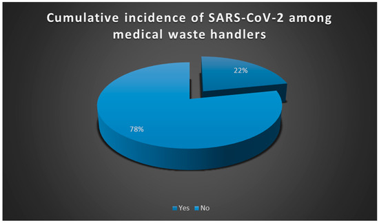 In this pilot study, occupational factors increasing the odds of SARS-CoV-2 infection in HCW handlers in selected healthcare waste facilities in Johannesburg were assessed to pave the way for a larger quantitative study on this workforce. Medical waste handlers encounter numerous occupational health risks due to the nature of their work. The preliminary findings indicate that PPE training and handwashing facilities, among other factors, may play a role in the risk of infection in those handling medical waste. The cumulative incidence of SARS-CoV-2 among medical waste handlers in this pilot study was 21.9%. The cumulative incidence of SARS-CoV-2 reported in the Gauteng City Region (GCR) between March 2020 and December 2022 was 33.2% (1,343,026 individuals) [16]. GCR reported the greatest admission rate of HCW across all provinces during the first and second wave of the SARS-CoV-2 pandemic [17].