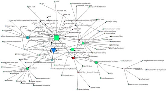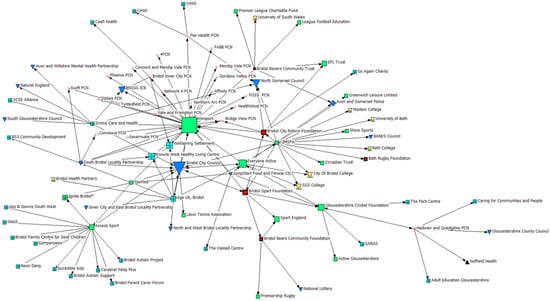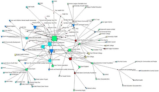 Findings for ineigenvector centrality are visualised in Figure 4, whereby larger icon sizes depict a higher degree of centrality. Findings suggest that Bristol Sport Foundation and Bristol City Robins Foundation (PSCOs) hold moderate ineigenvector centrality, demonstrating that highly connected and influential organisations regarded them as important partners within the network.