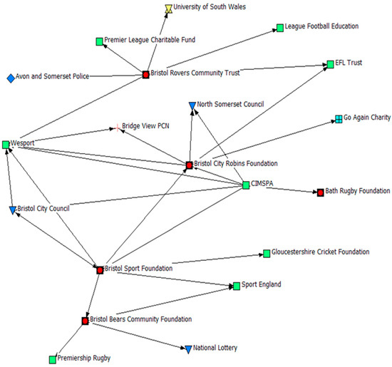 The findings for indegree centrality are visualised in Figure 1, whereby the larger-size icons (node size) reflect a higher level of indegree centrality (i.e., the greater the size, the greater the number of inbound connections). Our analysis suggests that within the network, reported connections to PSCOs within the sample were limited, and therefore they were not organisations that stakeholders viewed as key partners. Limited ties were highlighted between PSCOs within the network, whilst multisectoral ties also appeared low; particularly amongst VCFSE organisations and PCNs. Where connections were reported, CIMSPA, the national body for professional and organisational development in the sport and PA sector, identified multiple PSCOs (n = 3/5) as key partners. Moreover, Bristol City Council (Local Authority), a highly connected node, reported the Bristol Sport Foundation (PSCO), who utilise a multi-sport model to provide sport and PA opportunities to children throughout the region, as a key partner. When examining who PSCOs reported as key partners, ties with governing bodies who may provide guidance and funding to PSCOs, such as Sport England and EFL Trust, were commonly identified. To visualise these specific connections with and between PSCOs, an ego network analysis was undertaken (see Figure 2) whereby arrowheads represent an inbound connection. This represents the directional connections between the Bristol Sport Foundation, Bristol City Robins Foundation, Bristol Bears Foundation, Bristol Rovers Community Trust, and the Bath Rugby Foundation, and other organisations in the network.