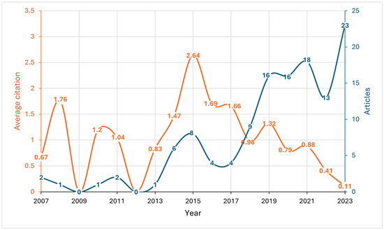 Annual scientific production and article citation on colorectal cancer screening in the Arab world from 2007 to 2023.