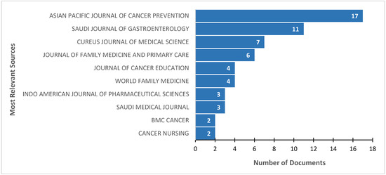 The articles included in this analysis were published in 70 sources. The Asian Pacific Journal of Cancer Prevention (impact factor (IF) 2.5, 17 publications) was the most frequent source of publication, with 24.3% of the articles published in this journal. The second most common journal was the Saudi Journal of Gastroenterology (IF 2.7, 11 publications, 15.71%), followed by the Cureus Journal of Medical Science (IF 1.2, 7 publications, 10%), the Journal of Family Medicine and Primary Care (IF 1.4, 6 publications, 8.57%), and the Journal of Cancer Education (IF 1.6, 4 publications, 5.71%) (Figure 2). All these sources are Quartile 3 journals, except for the Journal of Family Medicine and Primary Care, which is Quartile 4. The first 10 most frequent journals included almost half of all articles (47.58%), and four of them were regional/local, while six were global.
