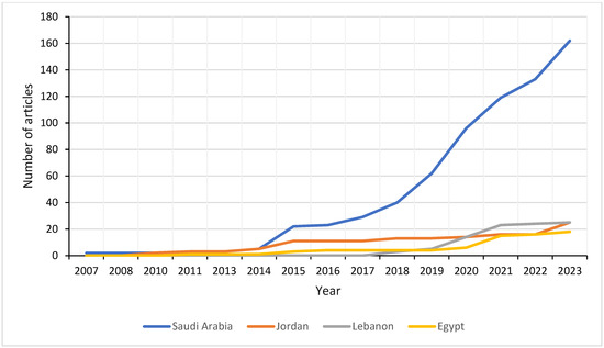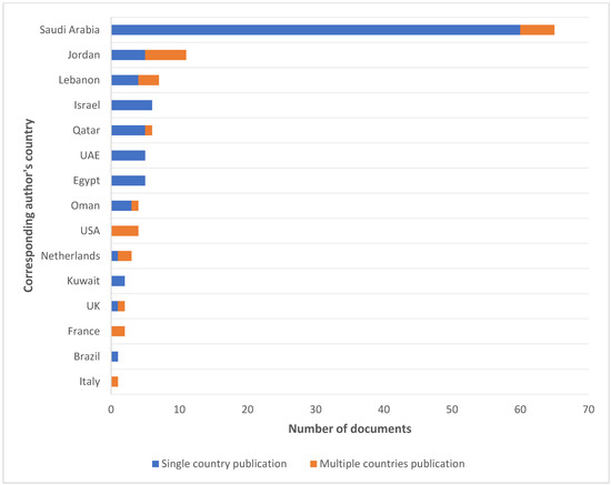 Saudi Arabia is the most prominent country of affiliation (162 affiliations, 46.82%), followed by Lebanon (25 affiliations, 7.22%), Jordan (25 affiliations, 7.22%), and Egypt (18 affiliations, 5.20%) (Figure 3). Most of the corresponding authors were affiliated with Saudi Arabia, and 92% of the articles from this country are single-country publications. This was followed by Jordan (45.4% single-country publications), Lebanon (57.1% single-country publications), Qatar (83% single-country publications), and UAE and Egypt (100% single-country publications) (Figure 4).