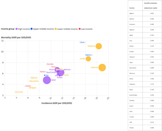 Scatter plot depicting country-specific per capita production of colorectal cancer screening research in Arab countries, along with corresponding incidence and mortality rates. Circle sizes indicate country production adjusted per capita, circle colors reflect the income status of each country, and the x-axis and y-axis represent the incidence and mortality rates (ASR per 100,000) of colorectal cancer, respectively.