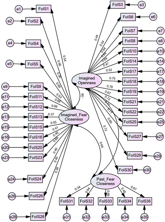 Descutner and Thelen [20], the authors of the Fear-of-Intimacy Scale (FoIS), proposed that fear of intimacy encompasses three underlying factors, but maintained that the scale operates as a unidimensional construct. However, previous studies have reported mixed findings regarding whether the FoIS truly reflects a single-factor structure. Given this uncertainty and the absence of validation evidence for the scale within Portuguese populations, we decided to conduct a confirmatory factor analysis (CFA) to evaluate its factor structure and ensure cultural consistency. As highlighted in the previously discussed studies, the 35 items can be grouped into one, two, or three distinct underlying components. Our EFA resulted in three factors.