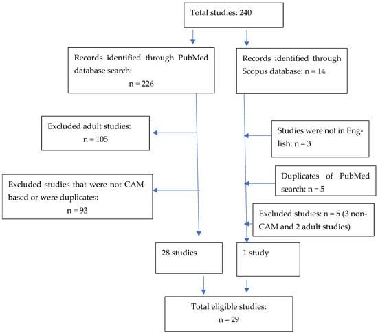Studies were excluded if the participants were outside of the adolescent age range (≥18 years). Non-CAM and non-English-language studies were also excluded. Of the 226 PubMed records, 105 were excluded because of the age of the participants (≥18 years). Further examination of each study revealed that 93 studies were not CAM studies, leaving 28 studies that met our inclusion criteria. Of the fourteen Scopus records, five studies were excluded because three were non-CAM studies and two were adult studies. Three non-English-language studies and five duplicate records were excluded, leaving one study that met our inclusion criteria. In total, 29 studies were included in this review (Figure 1).
