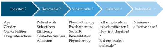 The classification may be used as part of a prescription strategy that should include the following steps (Figure 2): (1) reconsidering the drug indication and if it is safe for the patient’s profile; (2) evaluating whether a drug can be removed because of patient preference, absence of evidence-based efficacy for a specific condition, etc; (3) assessing non-pharmaceutical therapeutic options; (4) in the absence of a suitable alternative therapy, and if a drug prescription is needed, then consider the ecotoxicity classification to choose the drug with the lowest environmental impact, if applicable; and (5) regardless of the drug prescribed, the lowest effective dose must be prescribed. This strategy is well aligned with Smarter medicine guidelines provided by Choosing wisely Switzerland (URL https://www.smartermedicine.ch/de/home, accessed on 26 June 2024).