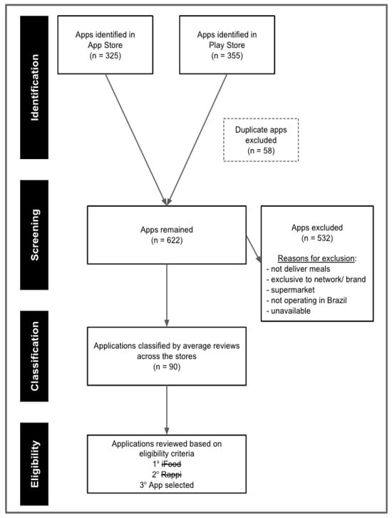 From this list, the following apps were excluded: (i) those not related to meal delivery (e.g., pharmacies, pet stores, games, or recipe apps); (ii) apps exclusive to a single network or brand (e.g., Burger King, KFC, McDonald’s); (iii) supermarket chain apps; (iv) apps not operating in Brazil (e.g., DoorDash, Uber Eats); and (v) apps unavailable for download at the time of data collection (e.g., Food Delivery). After applying these exclusions (n = 532), 90 apps remained.