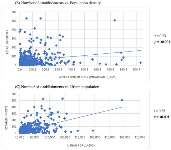 Correlation between the number of establishments listed in the meal delivery application and the demographic and socioeconomic characteristics of small and medium-sized cities.