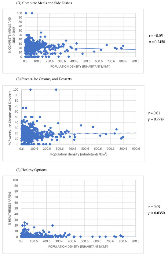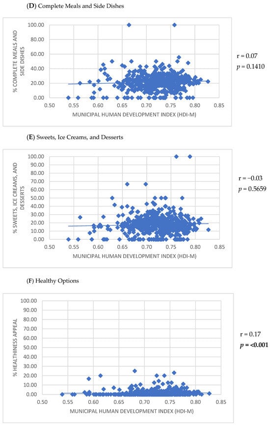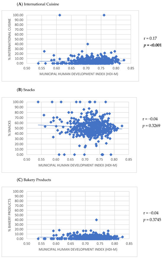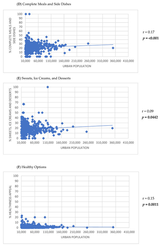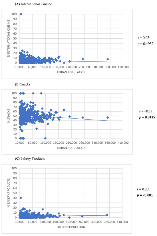 Positive correlations were observed between the number of establishments listed on the app and the HDI-M (r = 0.30; p < 0.001), population density (r = 0.23; p < 0.001), and urban population size (r = 0.55; p < 0.001) (Figure 2). Furthermore, the HDI-M showed positive correlations with the frequency of establishments using the keywords ‘International cuisine’ (r = 0.17; p < 0.001) and ‘Healthy options’ (r = 0.17; p < 0.001) (Figure 3). Similarly, population density was positively associated with the use of the keywords ‘International cuisine’ (r = 0.20; p < 0.001) and ‘Healthy options’ (r = 0.09; p = 0.0350) (Figure 4). In contrast, an inverse correlation was found between urban population size and the frequency of use of the ‘Snacks’ category (r = −0.11; p = 0.0115). However, urban population size was positively correlated with the use of keywords such as ‘Bakery products’ (r = 0.20; p < 0.001), ‘Complete meals and side dishes’ (r = 0.17; p < 0.001), ‘Sweets, ice creams, and desserts’ (r = 0.09; p = 0.0442), and ‘Healthy options’ (r = 0.15; p = 0.0011) (Figure 5).